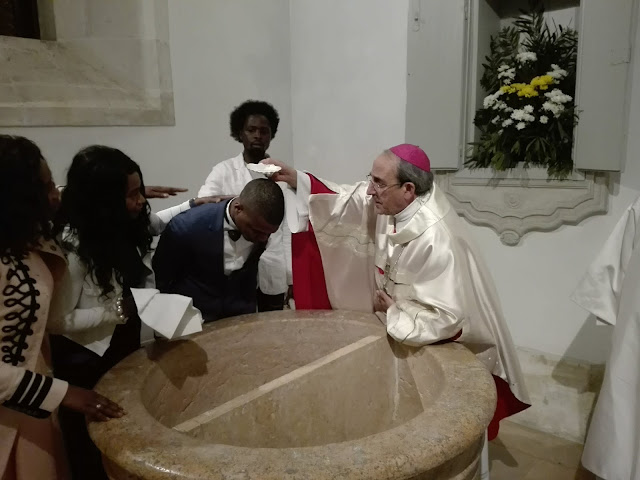 Na solene Vigília Pascal, a comunidade reunida em torno do seu Bispo, cantou os Aleluias pascais, alegrou-se com a ressurreição de Jesus e viu nascerem três novos filhos para a sua Igreja: a Carina, a Leonor e o Justiliano, três adultos que receberam, das mãos do Senhor Bispo, os Sacramentos da Iniciação cristã (batismo, crisma e eucaristia), fazendo parte da comunidade dos Filhos de Deus. É um motivo de grande alegria para todos.